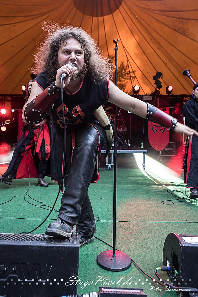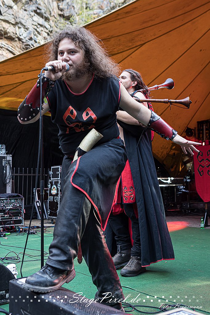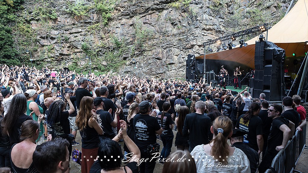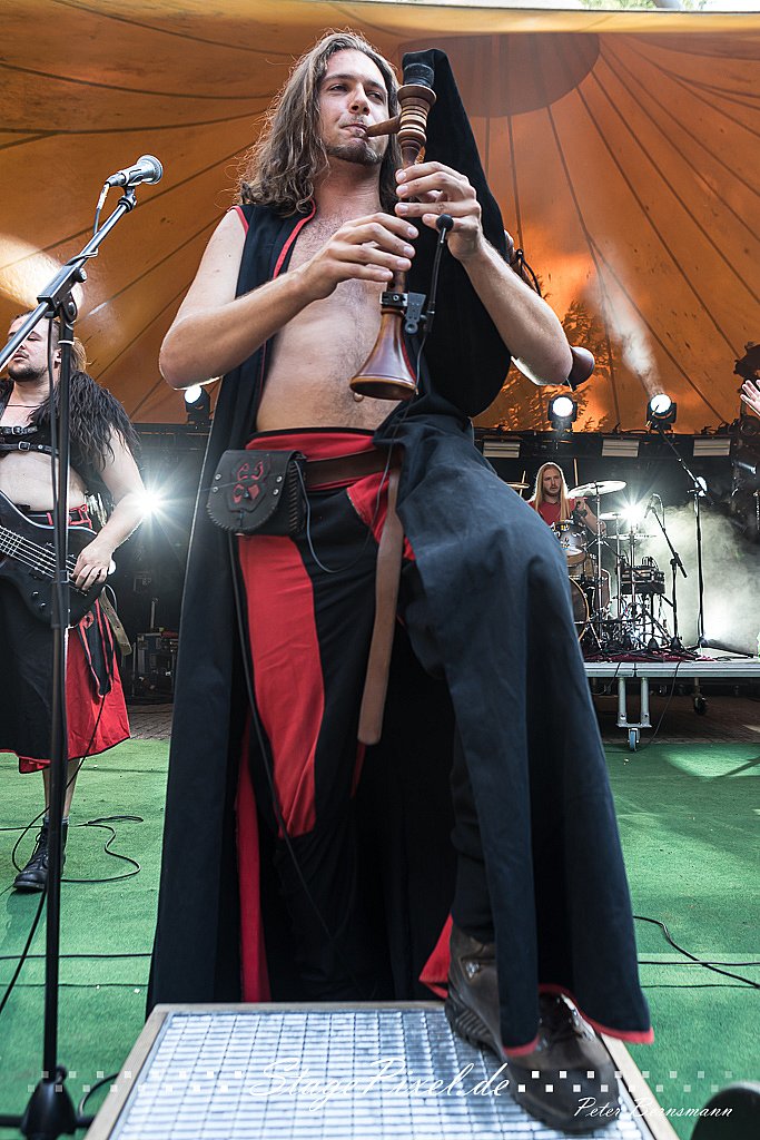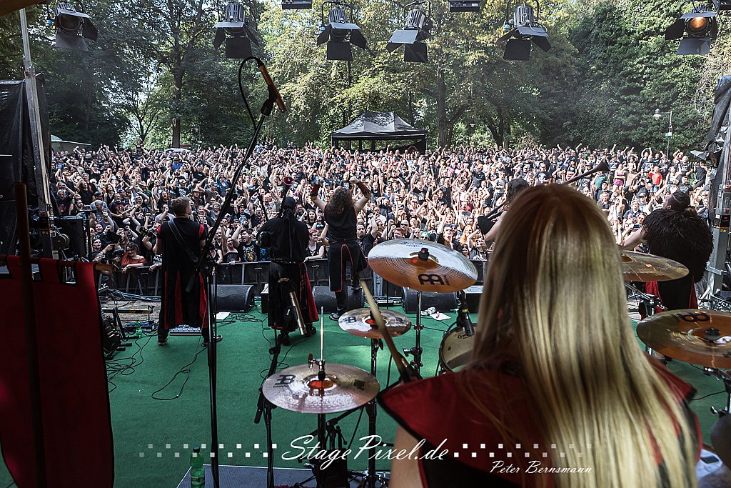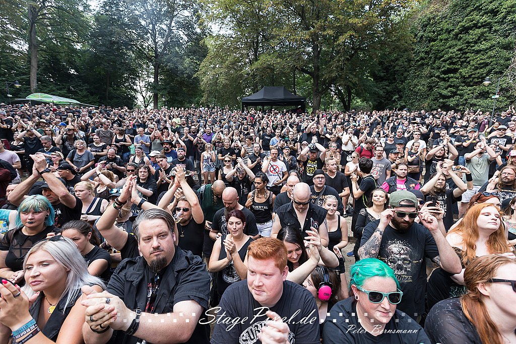 Das Feuertal Festival auf der Waldbühne Hardt in Wuppertal ist jedes Jahr im August ein beliebter Treff der schwarzen Szene. Bei ausverkaufter Veranstaltung feierten am 31.08.2019 rund 2.500 Fans bei bester Laune und schönstem Wetter. Lediglich ein Platzregen sorgte für eine kurze Unterbrechung der Veranstaltung, denn auf der Bühne sind nicht alle Flächen regensicher.